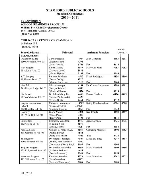 Stamford Public Schools - NeighborhoodScout Stamford, CT, 06902 KG-05: Julia A. Stark School 398 Glenbrook Rd. Stamford, CT, 06906 KG-05: K. T. Murphy School 19 Horton St. Stamford, CT, 06902 PK-05: Newfield School 345 Pepper Ridge Rd. Stamford, CT, 06905 KG-05: Northeast School 82 Scofieldtown Rd. Stamford, CT, 06903 KG-05: Rippowam Middle School 381 High Ridge Rd. Stamford, CT, 06905 06-08 100-plus parents rally to demand mask choice in Stamford ... Feb 09, 2022 · Stephanie Edmonds, with Stamford Parents United, speaks about parent's rights to over 100 anti-mask protesters who gathered in front of the Government Center in Stamford, Conn., on Tuesday ... Stamford Public Schools Calendar 2022 and 2023 ... Stamford Public Schools Calendar 2022 and 2023. This page contains the major holiday dates from the 2022 and 2023 school calendar for Stamford Public Schools in Connecticut. Please check back regularly for any amendments that may occur, or consult the Stamford Public Schools website for their 2021-2022 approved calendar and 2022-2023 approved ...