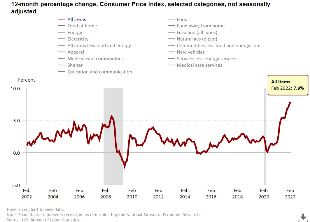 Inflation reaches 40-year high: January CPI posts 7.5% ... The Consumer Price Index (CPI) released by the Bureau of Labor Statistics Thursday morning registered a 7.5% annual gain in January. Consensus economists were looking for a 7.3% rise, according to...
