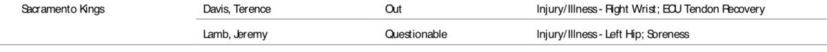 Los Angeles Kings Injuries - ESPN Los Angeles. Kings. Brown (upper body) was moved to injured reserve Sunday. Doughty was added to injured reserve Sunday but remains day-to-day with an undisclosed injury, Pierre LeBrun of The ... Sacramento Kings Injuries - ESPN Kings. Lamb (personal) has been ruled out for Friday's game against the Celtics. Fox is questionable for Friday's game against the Celtics due to a right hand injury. Davis (wrist) underwent ...